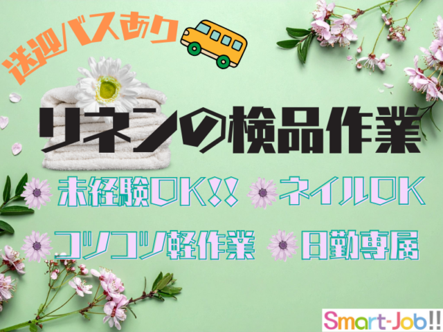 【城陽市】\工場だけどネイルOK♪髪色自由/未経験OK◆シーツ等の検品作業【105-004】
