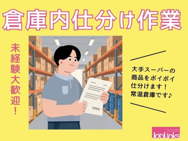 - 開梱,棚入れ,仕分け,検品,梱包,ピッキング,ラベル貼り